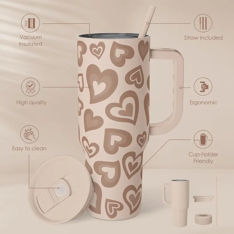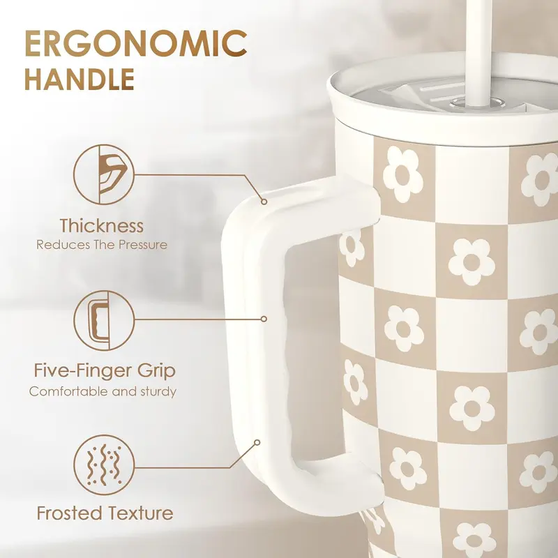 This tumbler combines generous capacity, modern style, and reliable insulation in one versatile design. The sturdy handle offers convenient portability, while the straw lid supports easy hydration throughout the day. With temperature retention lasting up to 12 hours, beverages remain enjoyable whether hot coffee in the morning or chilled drinks in the afternoon.