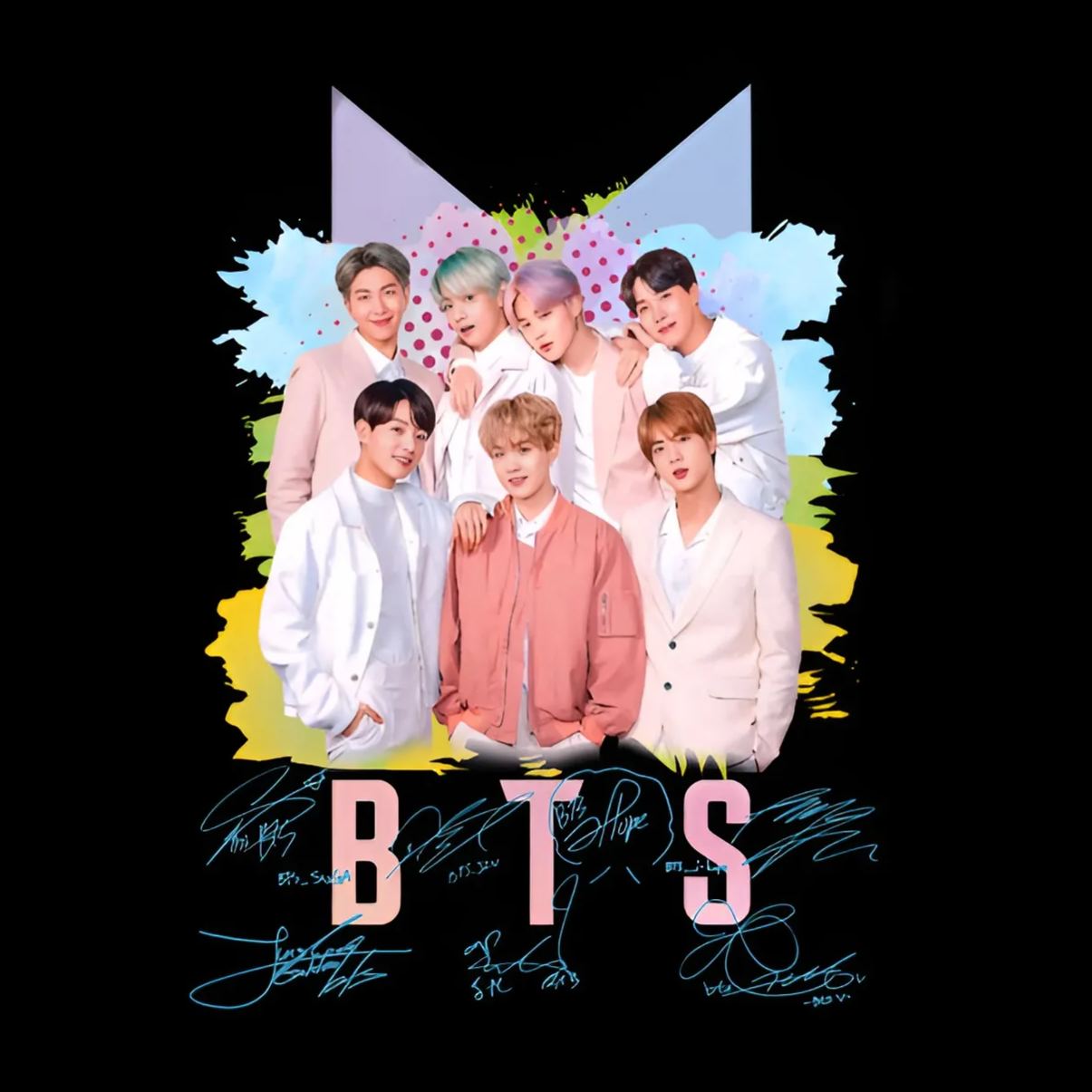 Printed Signatures: Authentic-style signatures for the members are printed around the base of the graphic, adding a personal element to the design.