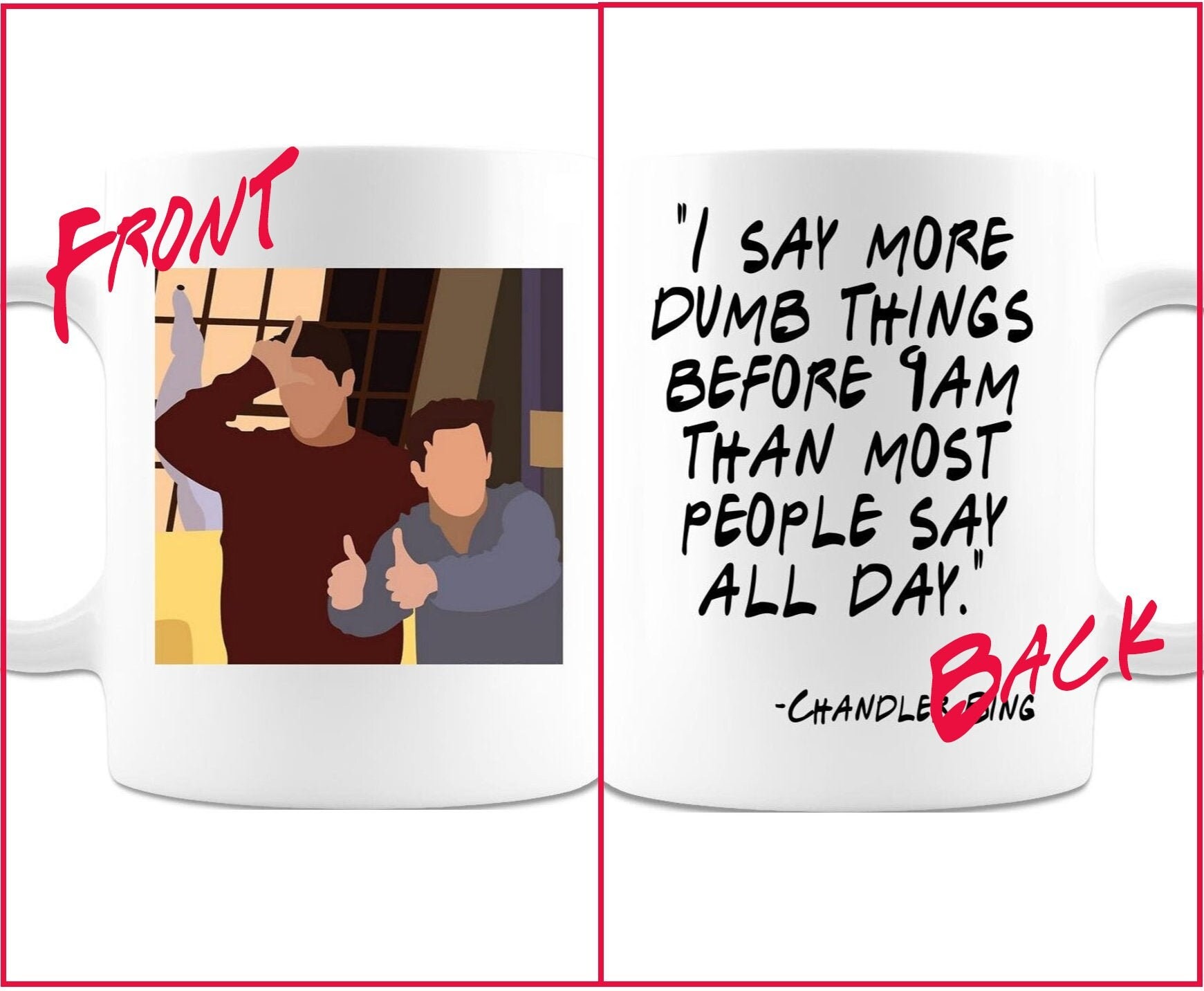 The Chandler Bing and Joey Tribbiani Friends Quote Ceramic Mug of the 1990s introduced characters whose dialogue remains relevant in modern conversation. This ceramic drinkware captures that spirit, focusing on the dynamic between two specific roommates from the hit series. Featuring a clean, white aesthetic, the item prioritizes the presentation of its graphic elements. Whether utilized for a morning beverage or as a desk accessory, it serves as a functional piece of media-inspired equipment. The design focuses on a specific quote that highlights the wit associated with the character Chandler Bing, paired with a visual representation of his friendship with Joey Tribbiani.