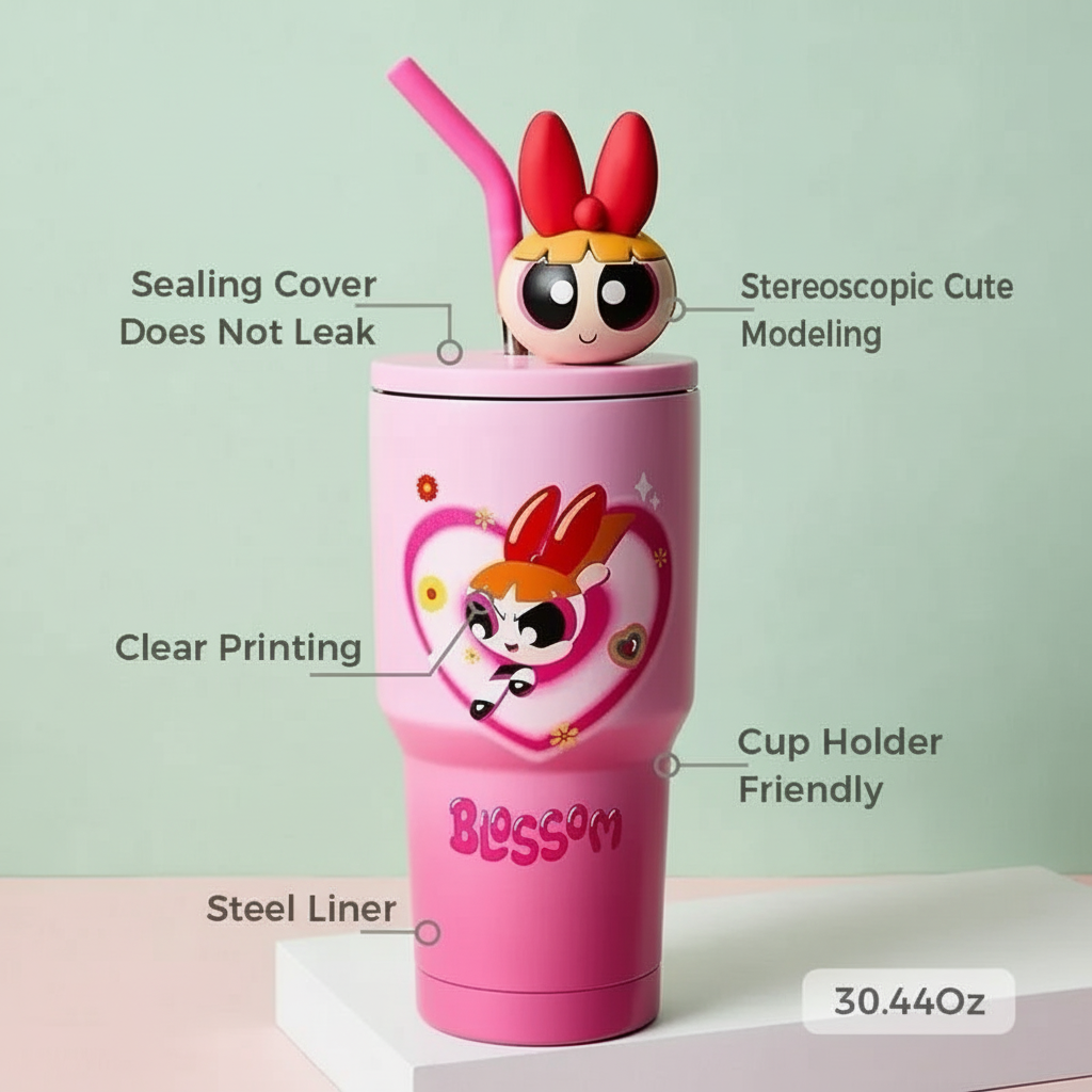 The Powerpuff Girls Blossom Pink Stainless Steel Tumbler offers a vibrant themed design suited for daily beverage use, fan collections, and display. The large capacity supports hydration throughout the day and fits many drink types, including iced beverages and warm liquids. Its stainless steel interior helps maintain temperature consistency while resisting external odor transfer. The wide structure provides balance on desks, counters, and tables. The reusable straw and lid assembly support clean drinking routines and reduce single-use waste during daily activities.