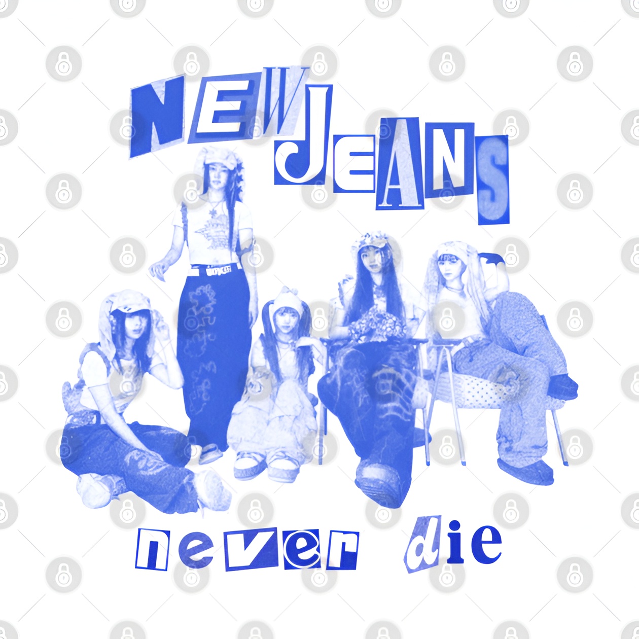 - Fragmented Graphic Typography: Features the phrases "Jeans" and "never die" in a distorted, blocky font inspired by zine aesthetics.